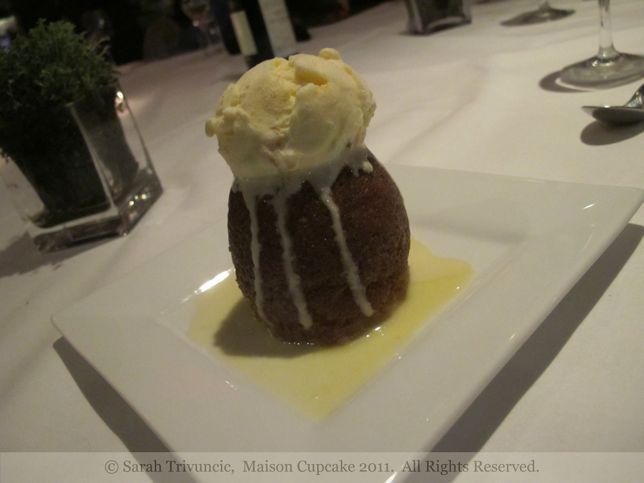 Dessert is a traditional South African Malvapeoding, a sticky warm sponge made with apricot jam. Here it’s served with vanilla ice cream made from custard infused with rooibos tea.