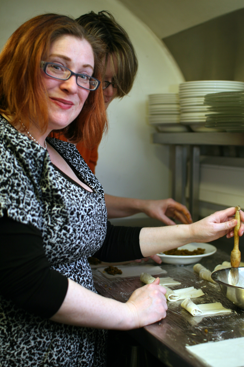 Chris is very surprised. For first timers he’s very impressed. We’ve worked faster than people there who get paid. Which makes us eminently employable in a professional kitchen apparently. My wrists would probably rule me out from this. When it’s my turn to tip the bundles out of the deep fat fryer, I limply wave the basket at Chris and ask him to do it for me! He has no idea how terrified I am of deep fat fryers. Perhaps this is an indication of how well I’d have done in my would be catering career?